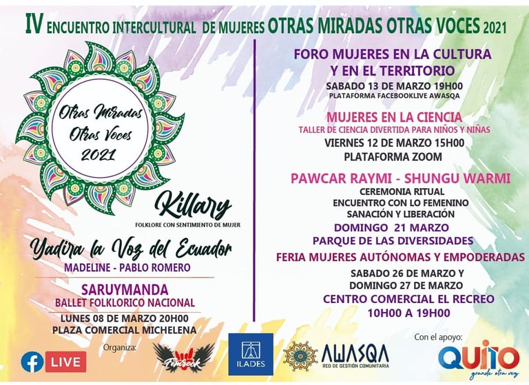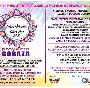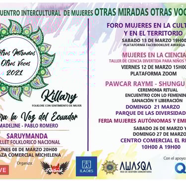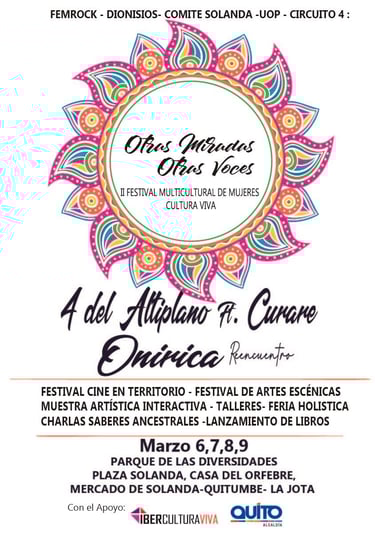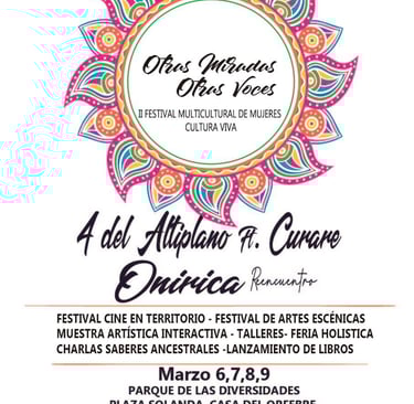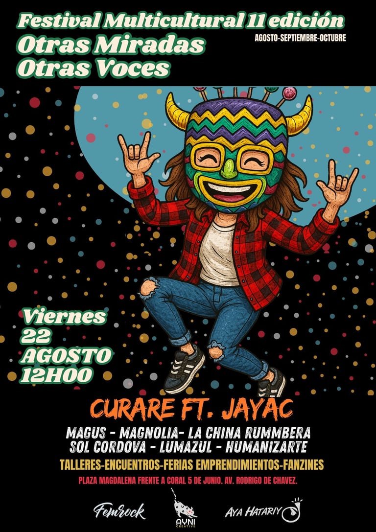 Este año, Otras Miradas Otras Voces te invita a ser parte de un momento histórico: Reunirnos para zapatear juntos al ritmo de nuestra música, nuestra fuerza y nuestra cultura. Artistas increibles como Magus, Magnolia, La China Rumbera, Sol Córdova, Lumazul, Humanizarte. El encuentro entre Titanes Jayac y Curare.
